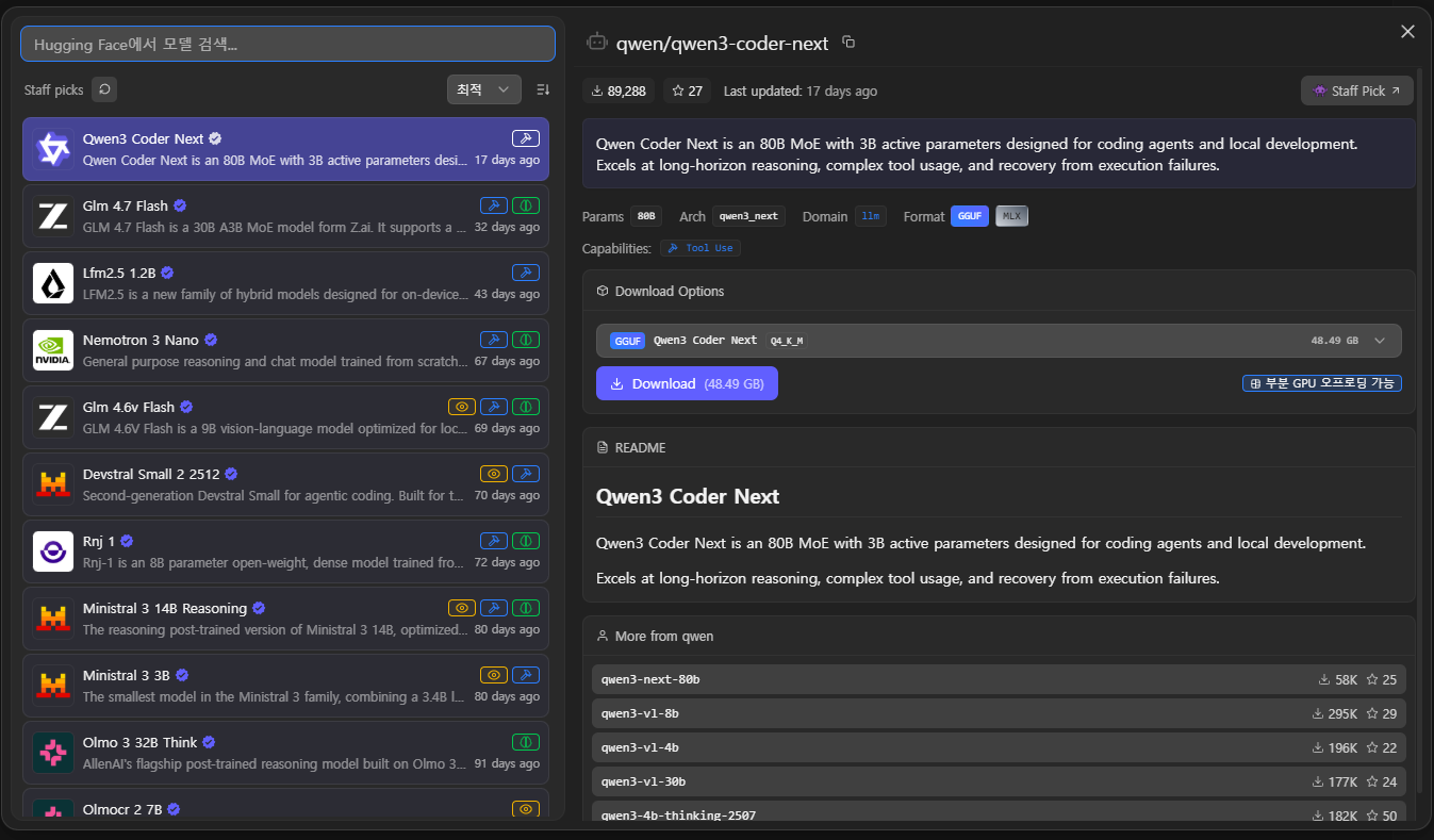 처음에 LM Studio 화면이 열리게 되면 본인의 PC사양에 맞게 모델을 추천해주면서 다운로드 받으라고 안내해준다
